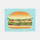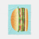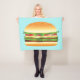 Esta manta incluye un delicioso ilustracion personalizado de una hamburguesa. La hamburguesa está hecha de carne, lechuga verde, tomates rojos, cebolla, trozos de queso y algunos pepinillos. El bollo parece recién horneado y tiene algunas semillas de sésamo encima.