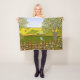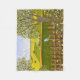 Una manta de lana con una hermosa imagen de una escena natural: un pájaro sentado en una cerca meteorológica, flores silvestres creciendo alrededor de la cerca, un granjero en un tractor, trabajando su tierra, árboles con hojas y tierras de cultivo con varios colores. Obra de arte original de W.B.