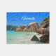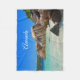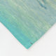 Una manta con una fotografía de una playa azul turquesa del océano con grandes rocas esparcidas a lo largo de la costa. Lugar tropical luminoso y soleado.