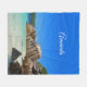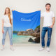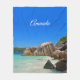 Una manta con una fotografía de una playa azul turquesa del océano con grandes rocas esparcidas a lo largo de la costa. Lugar tropical luminoso y soleado.
