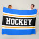 Este diseño deportivo y atlético presenta texto HOCKEY en negrita dentro de una franja negra ancha realzada con doble franjas de carreras blancas y amarillas contra franjas exteriores azules brillantes. El texto de este diseño se puede personalizar.