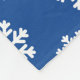 Galleta de hombre de pan de jengibre sobre un fondo de patrón de copos de nieve azul blanco.
