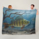 Beneath frozen water, a perch fish notices bait cast by someone ice fishing above.