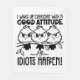 A humorous and sarcastic black-and-white graphic design showcases three bird silhouettes perched on a branch, each with big, expressive eyes. The black handwritten text reads, "I wake up every day with a good attitude and then idiots happen." This design is available on a variety of products, making it a perfect gift for bird lovers and fans of sarcastic humor.