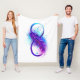 Símbolo infinito con una hermosa pluma pintada de color violeta y azul brillante sobre fondo blanco.