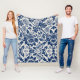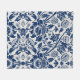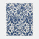 Intricate blue floral pattern on a light background, featuring stylized blooms and curling leaves, evoking a vintage, elegant feel.