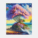 Una hermosa pintura digital de una exuberante isla verde en medio del océano. La isla está cubierta de árboles frondosos y flores, y el agua es azul claro. Un pequeño barco está anclado en la bahía y algunos se relajan en la playa. Este cuadro es perfecto para quien quiera escapar a un paraíso tropical.
