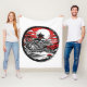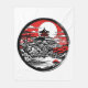 Ilustracion de un jardín japonés con árboles, estanque, rocas y una pagoda de colores rojo, blanco y negro rodeados de un círculo negro gris