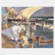 Valencia Beach by Morning Light" es un cuadro cautivador creado por el reconocido artista español Joaquín Sorolla. La obra de arte captura la esencia de una mañana serena en la playa de Valencia, España. El cuadro representa una amplia extensión de arena, bañada por una luz solar suave y dorada que ilumina el lugar con suavidad. El artista retrata con habilidad el ambiente tranquilo capturando el sutil juego de luz y sombra sobre la arena y el agua. El mar azul brillante se extiende hasta el horizonte, invitando a los espectadores a sumergirse en su refrescante belleza. La pintura también muestra el dominio de Sorolla de capturar la forma y actividad humanas. Figuras vestidas con ropa de colores claros salpican la playa, involucradas en diversas actividades lúdicas como pasear por la orilla, disfrutar del agua y tomar el sol. La holgada colada de Sorolla y su vibrante paleta aportan vida y movimiento a la escena, lo que evoca una sensación de calidez, alegría y relajación. "Valencia Beach by Morning Light" es un testimonio de la habilidad de Sorolla para capturar la belleza fugaz de la naturaleza y los placeres simples de la vida cotidiana, invitando a los espectadores a escapar en un momento de tranquilidad y felicidad costera.