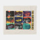 Cuadrícula colorida de estilo retro con los miembros del Escuadrón de Suicidio: Harley Quinn, Bloodsport, King Shark, Polka-Dot Man, Ratcatcher 2, Javelin, Peacemaker, The Thinker y Colonel Rick Flag.