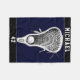 Regalo del jugador de Lacrosse con diseño de palo y bola sobre fondo azul marino. Editar texto para agregar el nombre del jugador y el número de equipo #.