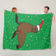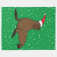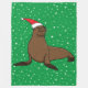 Un lindo ilustracion de un león marino con un sombrero de Santa frente a copos de nieve y fondo verde.