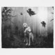 Fantástica fotografía de dos lobos blancos en un bosque encantador. La fotografía única muestra hojas flotando en el suelo niebla donde los magníficos animales se mantienen unidos.