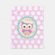 Búho lindo en sombras de púrpura, de rosado, las rosas fuertes y el gris que llevan una bufanda rosada y un gorra rosado de Papá Noel. Modelo de lunares purpúreo claro y blanco en el fondo. Regalo perfecto para cualquier amante del búho o el amante del pájaro. Algunos elementos por la cereza Clipart.