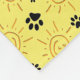Este divertido diseño de cama de perro presenta luz del sol dibujada a mano y patas negras sobre un fondo amarillo.