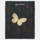 La imagen muestra una manta trenzada con una gran mariposa dorada en su centro sobre un fondo de textura oscura con sutiles tonos morados y azules. La manta tiene bordes anejos e incluye el texto del marcador de posición de personalizable "el texto que envía" en rosa a lo largo del lateral.