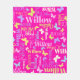 Pequeña mariposa de contorno gráfico de corte con manta de nombre personalizada. Esta manta tipográfica de texto brillante rosa, púrpura, azul acuático, rosa, verde limón, amarillo y crema también puede ser personalizada con su propio nombre corto, actualmente lee Willow. Otros nombres y colores disponibles o contactarme para solicitar nombres. Arte original y diseño de Sarah Trett para www.mylittleeden.com