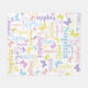 Pequeña mariposa de contorno gráfico de corte con manta de nombre personalizada. Esta manta tipográfica de texto suave morado, azul, rosa, verde, amarillo y coral también se puede personalizar con tu propio nombre corto, actualmente dice Sophia. Otros nombres y colores disponibles o contactarme para solicitar nombres. Arte original y diseño de Sarah Trett para www.mylittleeden.com