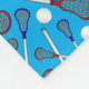 El modelo moderno y de moda del lacrosse de los deportes con los palillos rojos y azules del lacrosse y una bola de goma blanca con el fondo del azul de cielo y con la raya negra azul personalizada con apenas añaden sus regalos conocidos o los regalos del monograma o sus iniciales para un regalo único. Ideas del regalo de los deportes para los hombres y muchachos y chicas. Ideal para los cumpleaños.