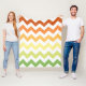 Esta moderna manta de lana presenta un patrón de chevron a la moda en una paleta de colores otoñales con tonos verdes, amarillos y naranjas.