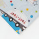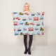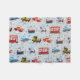 Autobuses, autos, aviones, trenes, barcos y camiones en un divertido patrón ilustrado en azul.
