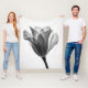 A close-up, monochrome photograph showcases a tulip flower against a bright white background. The flower's petals are delicately rendered, with visible veins adding texture. The image captures the flower from a low angle, emphasizing its upward reach. The stem is slender and dark, contrasting with the lighter petals. The overall mood is serene and elegant, highlighting the flower's natural beauty.