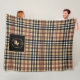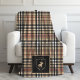 At the center, a sophisticated family crest with custom monogram is paired with an equestrian polo player silhouette and horse motif, creating a look that feels both traditional and distinguished. The combination of tartan plaid and equestrian elements gives this fleece blanket a timeless, heirloom-inspired feel that blends vintage charm with modern comfort.