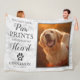 Una manta conmemorativa de la fiera de un perro mascota que presenta una foto atesorada de tu querido perro, un fondo moderno de mármol blanco, una huella de pata con corazón, una cita para recordar la simpatía que dice "dejaste tus huellas de pata para siempre en mi corazón", además de su nombre y fechas.