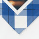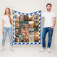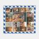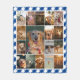 frazada de eslora de mascota conmemorativa con un borde de manta azul y blanco impreso. Personaliza esta manta acogedora con diecisiete de tus fotos de mascotas. Añade fotos de mascotas a esta rústica manta de fotos de moda de campo con un patrón de manta azul como borde y tu nombre de mascota arriba Dejaste huellas de almejas en nuestros corazones, flanqueadas por huellas de pata.