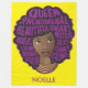 Este diseño presenta "Reina, fenomenal, bella, inteligente, mágica, jefa, amorosa, sexy, independiente, divertida, creativa y fuerte" anidada en su afro negro, con collares de capas en un fondo amarillo.