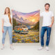 This 1960s inspired van life design features a vintage sunset scene. A painted hippie camper bus is parked in front of a shimmering lake, surrounded by towering mountain peaks and blooming wildflowers. Made for adventurers, travelers, dreamers, and anyone who feels most alive chasing the next horizon. This soft and cozy fleece throw blanket is a great way to show off your love for exploring. Add groovy outdoor vibes to your home decor, mountain cabin, or RV with this retro blanket.