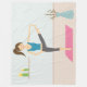Un ilustracion personalizado y agradable de un chica de bonito que hace yoga en una bonita sala decorada con una alfombra rosa de yoga, una estantería con dos velas verdes y un jarrón azul con ramas marrones. La mujer está haciendo la posición extendida de mano a pie. Ella lleva puesto un tanque azul y pantalones grises oscuros.