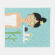 El ilustracion personalizado de Destei de una hermosa mujer de spa. La mujer tiene el pelo negro que está en un moño y hay una flor frangipani blanca tropical al lado del moño. La mujer lleva una toalla blanca sobre su cuerpo y tiene cortes de pepino sobre sus ojos. Junto a la mujer hay una estantería blanca con piedras de masaje y dos velas blancas. Debajo de la estantería hay dos plantas verdes de bambú que aportan un toque más balneario al diseño. El fondo es un divertido patrón de azulejos azul verde azulado.