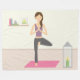 Un ilustracion personalizado de una mujer de bonito que hace yoga en una sala de bonito decorada con una estantería con libros, jarrón y un cuadro. La sala también incluye una estera de yoga rosa y una linterna gris con una vela verde en el interior. La mujer está haciendo la pose del árbol y lleva puesta una camisa morada y pantalones grises.