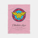 Esta manta de bebé adorable presenta el clásico logo de la Mujer Maravilla Personalice por los detalles de nacimiento de su hijo.