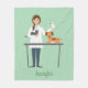 Diseño bonito para veterinarios que presentan el ilustracion personalizado de Destei de una veterinaria femenina con algunos animales. La mujer lleva puesto un abrigo blanco de laboratorio mientras sostiene un gato gris y un ave de loro tipo gallo. También hay un lindo perro marrón sobre una mesa. El color de fondo es verde claro. También hay un área de texto personalizable para un nombre.