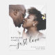 Este diseño moderno tiene las palabras Nothing Fancy Just Love en un estilo con letras a mano en la parte inferior de una fotografía de tamaño completo. Puede agregar nombres y la fecha del boda a la esquina inferior derecha.