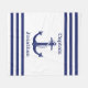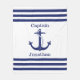 El diseño náutico de esta manta tiene un ancla azul marino en el centro con la palabra "Capitán" en la parte superior, junto con un nombre que podrás personalizar debajo y bordeado por tres franjas horizontales azul marino y blanco en cada extremo. Gran regalo para un padre, tío, hermano o amigo que ama navegar.