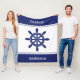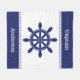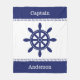 Personalice esta manta del capitán con su nombre. El diseño presenta un dibujo de la rueda de un capitán azul marino y un borde de cuerda azul marino y blanco. La palabra "Capitán" está arriba y abajo es un nombre que usted debe personalizar.