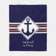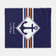 Elegante manta de la flota azul NAUTICAL de la Marina, mostrando un gran ancla dentro de un cuadrado blanco en el centro. En el fondo hay rayas en el color de BLANCO y TÁN, colocadas sobre un fondo oscuro NAVY AZUL. En la parte inferior está el TEXTO del PERSONALIZABLE que dice ANCHORED IN CHRIST, que puede PERSONALIZAR añadiendo su nombre o su nombre del barco, etc.