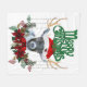 Cabra pigmea con su sombrero de Papá Noel y corderos adornados con adornos estriados de Navidad, rodeados por una corona navideña de poinsettias rojas, conos de pino, vegetación y un gran arco rojo. Calligraphy Text on front dice Feliz Navidad, A © goatlady GetYerGoat™ original