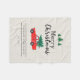 Esta manta de lana presenta un moderno diseño de una casa de campo acentuado con una acuarela vintage de un auto rojo que lleva encima un árbol de Navidad recién cortado. La caligrafía escrita a mano dice "Feliz Navidad" con texto personalizado para tu apellido.