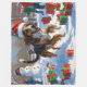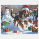 Un ilustracion vacacional reconfortante con un perro alegre jugando en la nieve, usando un sombrero de Santa y rodeado de coloridas cajas de regalos. En el fondo, los niños construyen un muñeco de nieve al lado de un árbol de Navidad cubierto de nieve, creando un alegre maravilloso país invernal. Perfecto para difundir alegría por las vacaciones y capturar la magia de los Navidades.