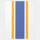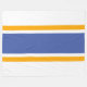 Este divertido diseño colorido presenta rayas flotantes doradas amarillas que resaltan una amplia franja central azul en negrita contra un fondo blanco.