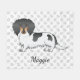 El original ilustracion personalizado de Destei de un lindo cabello largo negro y color de abrigo de pieballe color dachshund raza perro. El fondo tiene un patrón de huellas de perros grises. También hay un área de texto personalizable para un nombre.