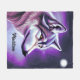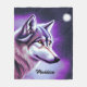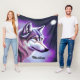Esta es una hermosa manta de lana para un amante del lobo que presenta un ilustracion de una mítica cara de lobo en perfil con tonos blancos y morados y azules. El nombre de la manta es personalizable con el nombre del destinatario.