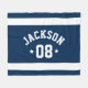 La manta personalizada para atletas de lana deportiva incluye un nombre o apellido en letras esporádicas curvas junto con un número de equipo. Las amplias franjas horizontales y las estrellas acentúan este diseño sencillo y elegante. El esquema de color azul marino y blanco se puede modificar para que se coordine con los colores del club o de la escuela.