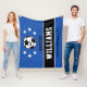 Una manta personalizada para jugadores de fútbol cuando no están anotando goles en el campo, ¡y para que sus padres apoyen a sus hijos y se mantengan calientes en juegos de niños! Hace de un equipo un regalo único para los torneos de viajes. El diseño incluye una pelota de fútbol personalizada con el número de uniforme del jugador, texto personalizado para el nombre y apellido del jugador y texto moderno para el nombre del equipo de fútbol. Presentan un diseño moderno y elegante con letras de jersey esporádicas y simples rayas horizontales con acentos estelares. El esquema de color azul real, negro y blanco se puede modificar para coordinar con los colores del equipo.