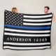 Bandera delgada de la línea azul - diseño de la bandera estadounidense en colores con bandera de la policía, diseño azul negro moderno. Perfecto para todos los oficiales de policía, la madre de la policía y la esposa de la policía. Personaliza con el nombre del oficial de policía, o número de placa, o apellido. Esta delgada manta azul con número de placa es perfecta para regalos de retiro de las fuerzas del orden o regalos de graduación de la policía. ... DERECHOS RESERVADOS © 2020 Judy Burrows, Black Dog Art - Todos los derechos reservados. Oficial de Policía Personalizado Cubierta Delgada De La Línea Azul