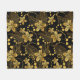 Tonos dorados hojas tropicales y flores en un fondo negro.